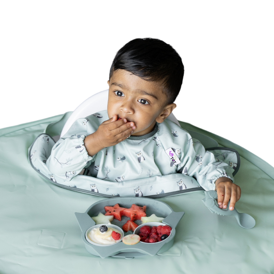 Baveta moderna cu maneci lungi, cu design vesel cu bufnite, extrem de utila pentru a proteja hainutele...