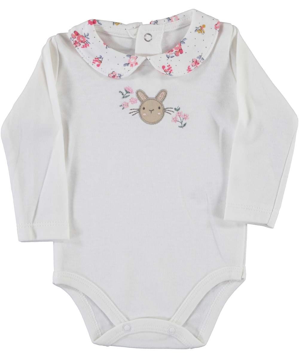 Body cu maneca lunga din bumbac, Iepuras Trei capse la spate Decupaj pe rotund la gat Guleras cu imprimeu trandafiri Aplicatie brodata cu Iepuras pe piept Inchidere cu capse intre picioare. Poate fi purtat ca atare sau poate fi combinat cu o fustita sau cu o rochita de vara fara maneci Foarte elegant.Culoare: AlbMaterial: Bumbac 100%