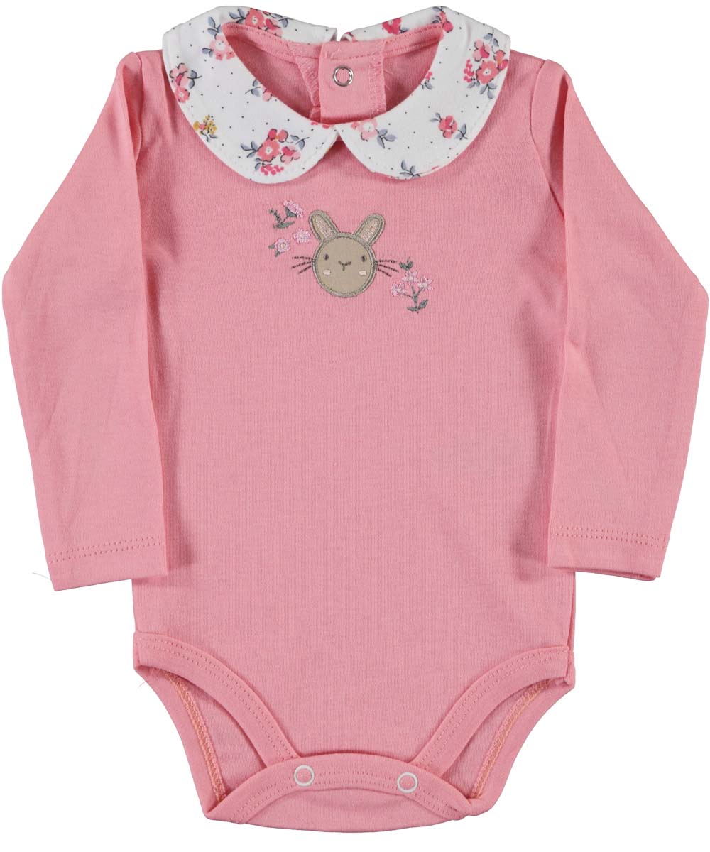 Body cu maneca lunga din bumbac, Iepuras Trei capse la spate Decupaj pe rotund la gat Guleras cu imprimeu trandafiri Aplicatie brodata cu Iepuras pe piept Inchidere cu capse intre picioare. Poate fi purtat ca atare sau poate fi combinat cu o fustita sau cu o rochita de vara fara maneci Foarte elegant.Culoare: Roz Material: Bumbac 100%