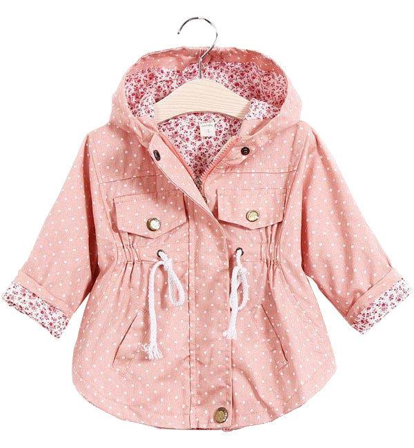 Descriere: Geaca eleganta de primavara cu gluga, pentru fete. Inchidere cu fermoar si aparatoare cu capse . Maneca lunga. Se strange cu snur la mijloc. Captusita material inflorat de bumbac 100%. Capse metalice. Foarte vesela. Ideala pt primavara si zilele racoroase de vara.Culoare: RozMaterial: Exterior: Bumbac 100% Captusala: Bumbac 100%
