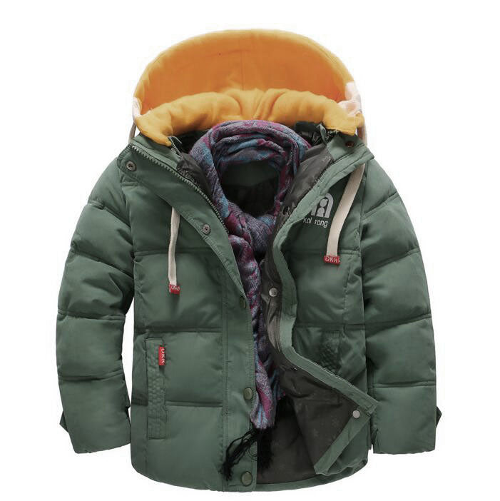 Geaca groasa cu gluga pentru baieti. Inchidere cu fermoar. Doua buzunare dispuse lateral. Gluga detasabila Calduros si foarte elegant. Potrivit pentru evenimente speciale.NOTA: Esarfa este de decor si nu se liveraza impreuna cu geacaCuloare: Verde OliveMaterial: Material sintetic 100%
