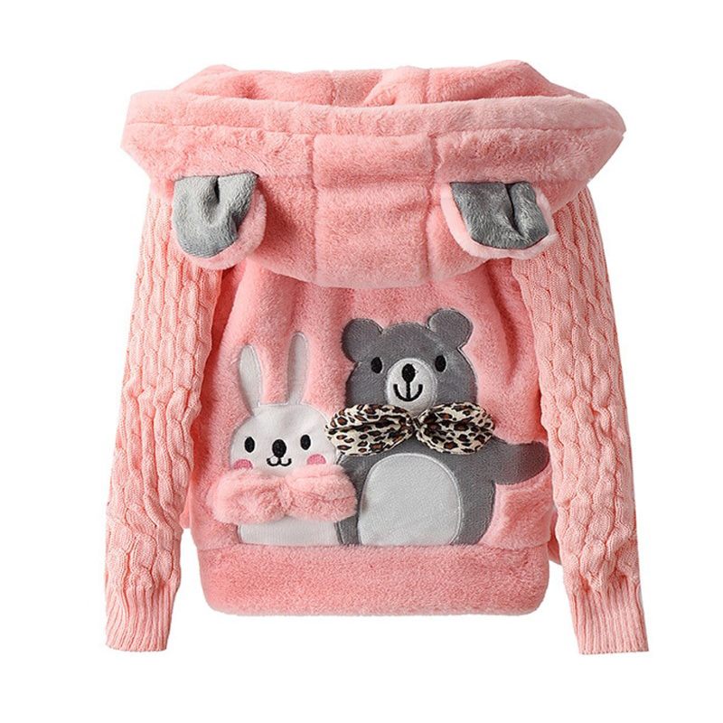 Cardigan gros cu glug din blanita sintetica a pentru fete Maneci lungi din material tricotat si matlasate pe interior Gluga cu urechiuse aplicate Inchidere cu fermoar. Cheita delicata, metalica Gluga ampla cu blanita sintetica la terminatie. Se poate stange cu un siret care se termina in ciucuri Doua buzunare dispuse lateral cu ursuleti aplicati Ursulet si Iepuras cu funda aplicati pe spatele cardiganului Placut la atingere si la purtat. Calduros. Ideal pentru sezonul receCuloare: Roz.Material: Sintetic