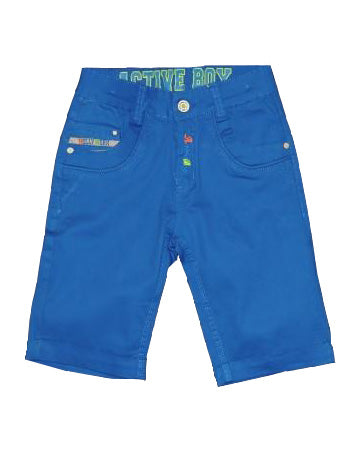 Pantaloni scurti Active Boy. Terminatia pantalonului se face prin manseta. Inchidere cu fermoar si nasture metalic la betelie. Betelia dotata cu gaici pentru curea. Doua buzunare dispuse pe lateral care la terminatie sunt decorate cu o capsa. Buzunar aditional mic In interiorul buzunarului din partea stanga.. In partea din spate sunt aplicate doua buzunare care sunt decorate la capat cu capse. Pe buzunarul din spate stanga este brodat discret logo,ul Active Boys.Culoare: Albatstru InchisMaterial: Bumbac 100%