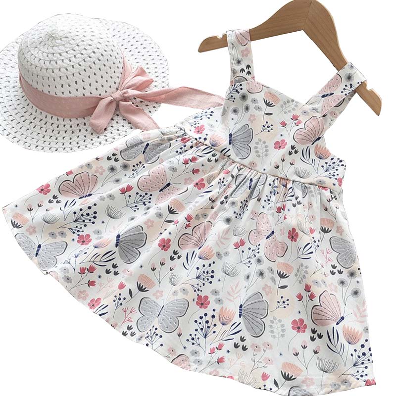 Rochita de vara Kika, bretele si palariuta, roz prafuit cu fluturasi imprimati