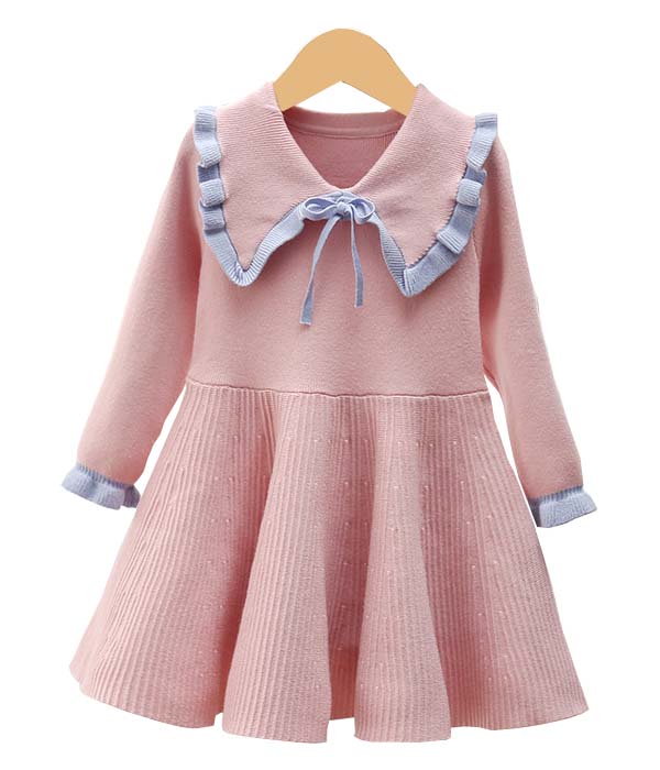 Descriere: Rochita tricotata cu maneca lunga Wendy. Guleras amplu ascutit tip fluturas. Inchidere la gat cu snurulet din materialul rochitei Volanas discret la terminatia manecii si la terminatia gulerasului Croiala lejera. Tricotaj. Ideala pentru sezonul rece. Culoare: RozMaterial: Bumbac 95% Elastan: 5%