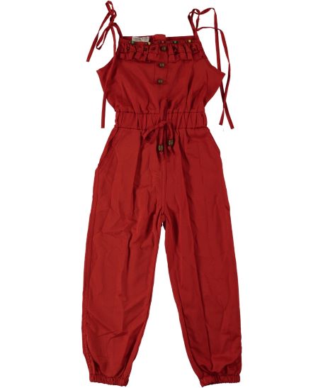Salopeta de vara fara maneci din material subtire, Veronica In parte superioara este aplicat un volanas discret decorat cu bilute colorate din lemn Inchidere cu fermoar la spate Talia este marcata de un elastic lat. Se muleaza frumos pe corp si da o nota de eleganta Buzunare laterale In partea de jos - pantalonii sunt stransi pe picior printr-un elastic moale Lungime: glezna.Culoare: RosuMaterial: Bumbac 100%