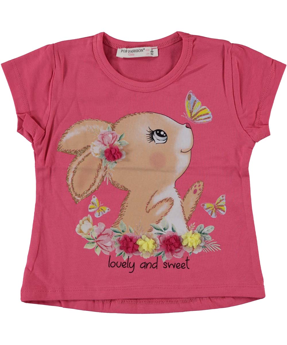 Tricou cu maneca scurta. Imprimeu Iepuras Aplicatii floricele 3D din voale Elemente sclipicoase. Foarte elegantCuloare: Roz inchisMaterial:...