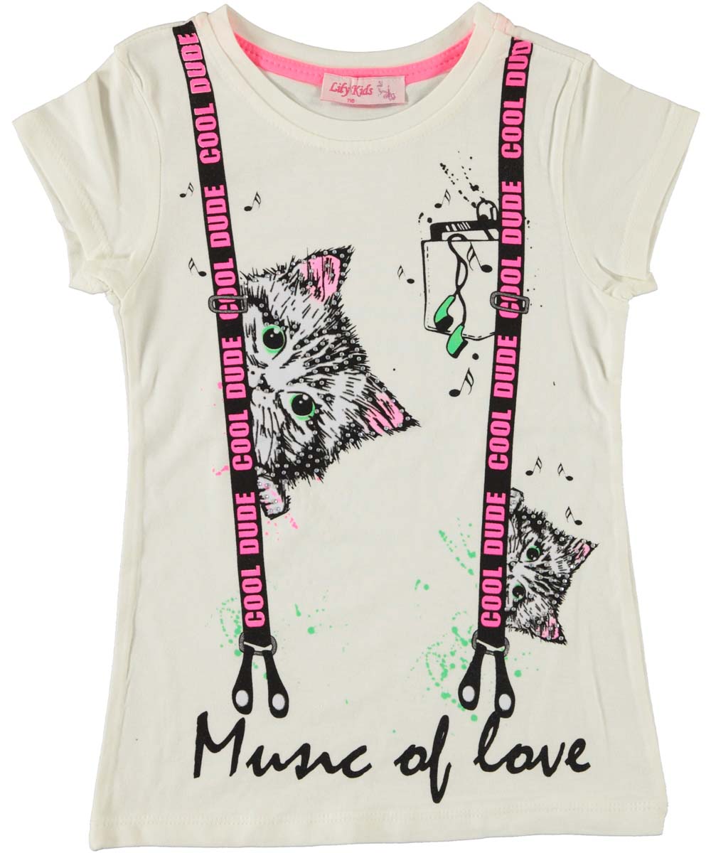 Tricou cu maneca scurta. Imprimeu Pisicuta Music of Love Elemente sclipicoase, aplicatii cu strasuri Foarte elegantCuloare: albMaterial:...